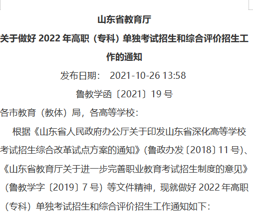 山东省教育厅 关于做好2022年高职(专科)单独考试招生和综合评价招生工作的通知