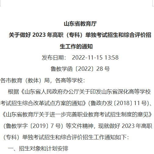 山东省教育厅 关于做好2023年高职(专科)单独考试招生和综合评价招生工作的通知