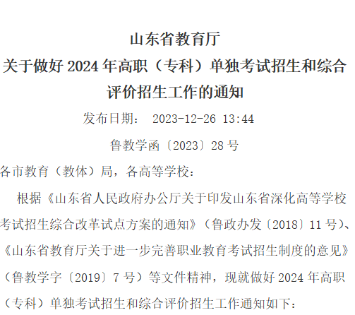 山东省教育厅 关于做好2024年高职(专科)单独考试招生和综合评价招生工作的通知