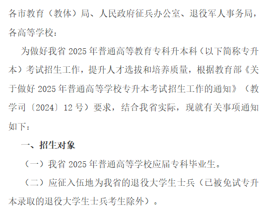关于做好2025年普通高等教育专科升本科考试招生工作的通知
