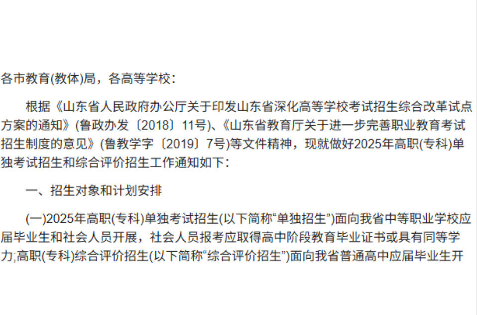 山东省教育厅关于做好2025年高职(专科)单独考试招生和综合评价招生工作的通知